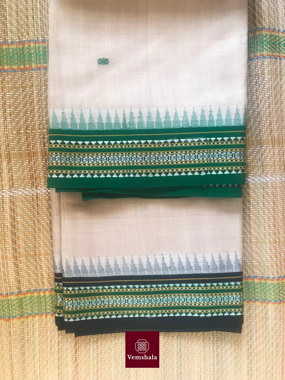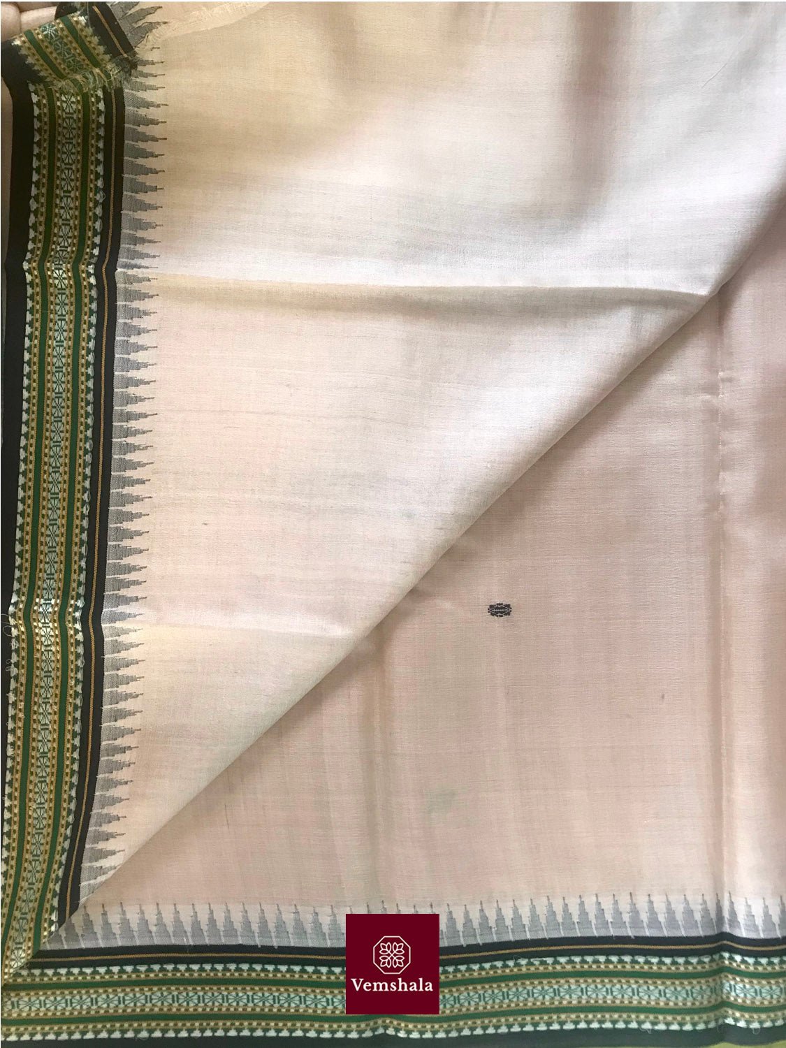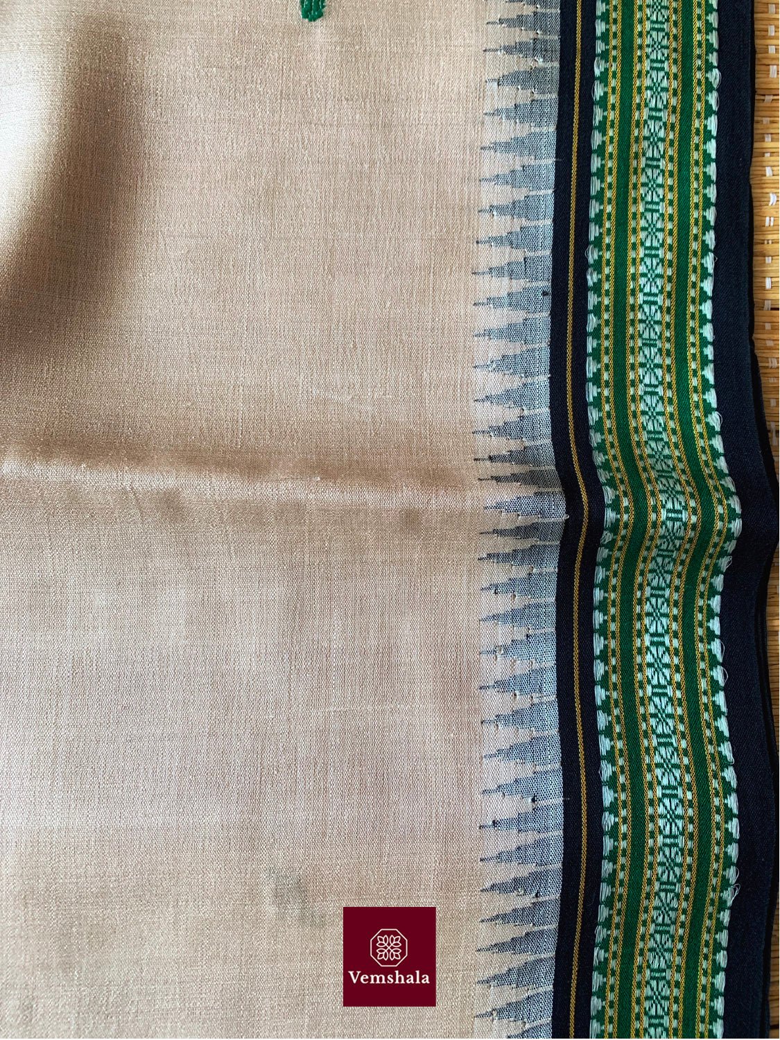The uniqueness of the Tussar Karvati Kinar Saree is its border wherein traditional motifs are woven with extra warp threads controlled by lattice dobby and the saw tooth like temple motifs that are woven in varied sizes.