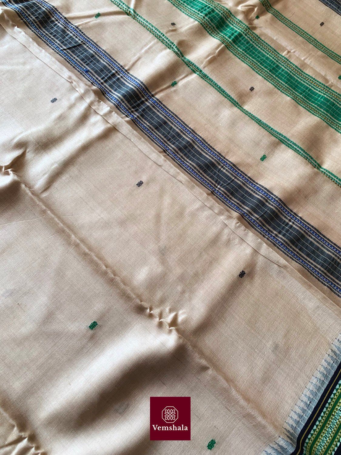This handwoven saree from Vidarbha, a north-eastern region in Maharastra, India, is all about the beautiful, intricate borders which are designed combining different coloured threads in various patterns. “Karvat” in Marathi is the saw and since the designs look like saw tooth, the saree is known as Karvati Kinar or Karvat Kati. District Bhandara is a Tussar cocoon producing area and thus having plenty of raw material, raw or natural Tussar was introduced in weaving of Karvati Kinar Sarees.