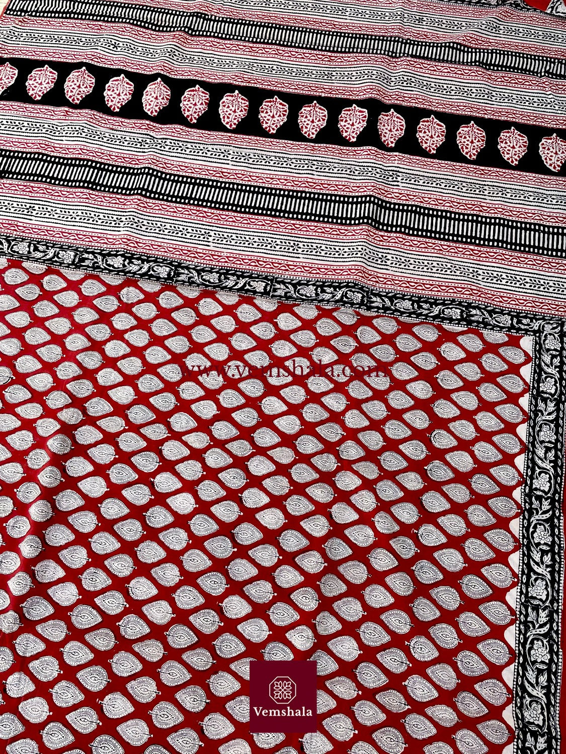 A delicate handblock printed Mul Cotton with a stunning Bagru print in classic and evergreen red/ecru/black color palette !