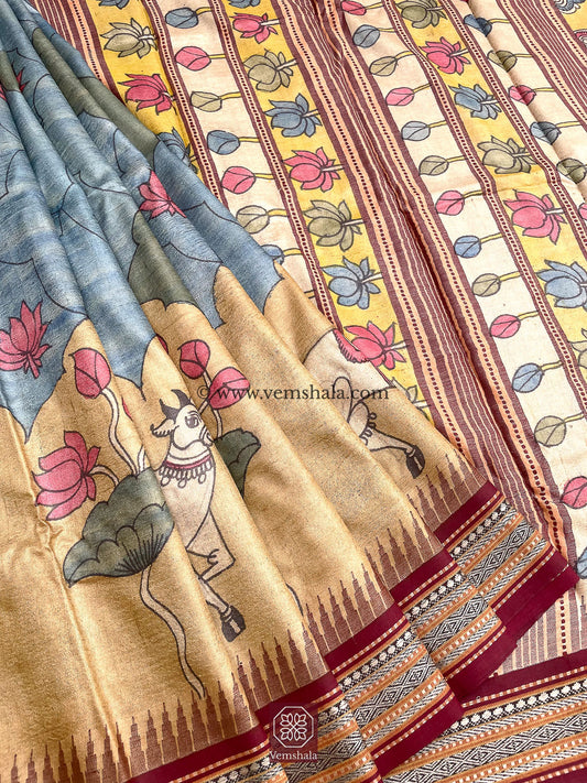 Natural Ceremonial Motiffs Pen Kalamkari Tussar Silk Saree : Aria