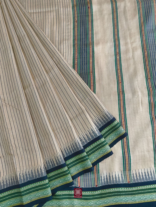 Natural / Blue / Green with Stripes Karvati Kinar Tussar Saree