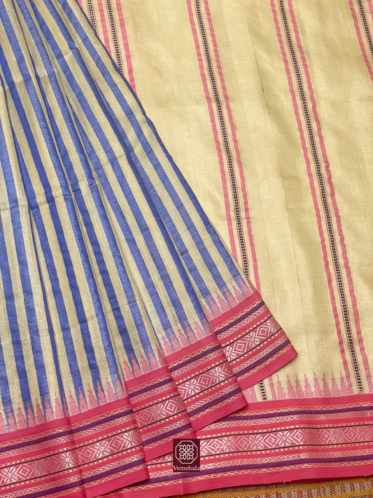 Natural / Blue / Magenta Pink (Stripes / Border) Karvati Kinar Tussar Saree