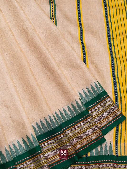 Natural / Coffee / Green with Stripes Karvati Kinar Tussar Saree