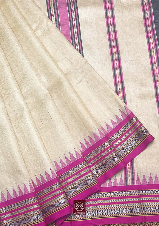 Natural / Magenta Pink with Stripes Karvati Kinar Tussar Saree