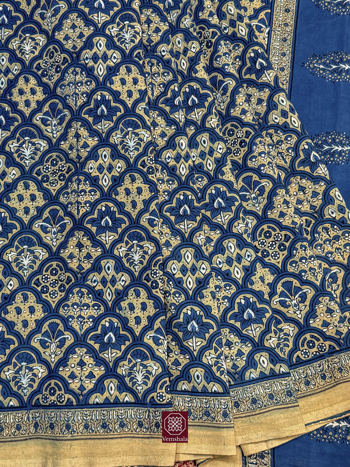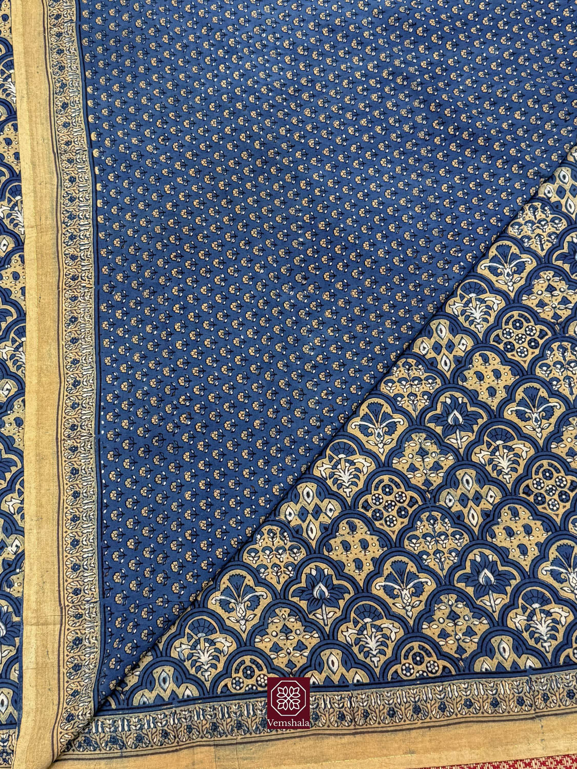 Indigo / Ecru Ajrakh Hand Block Cotton Saree : Dhwani