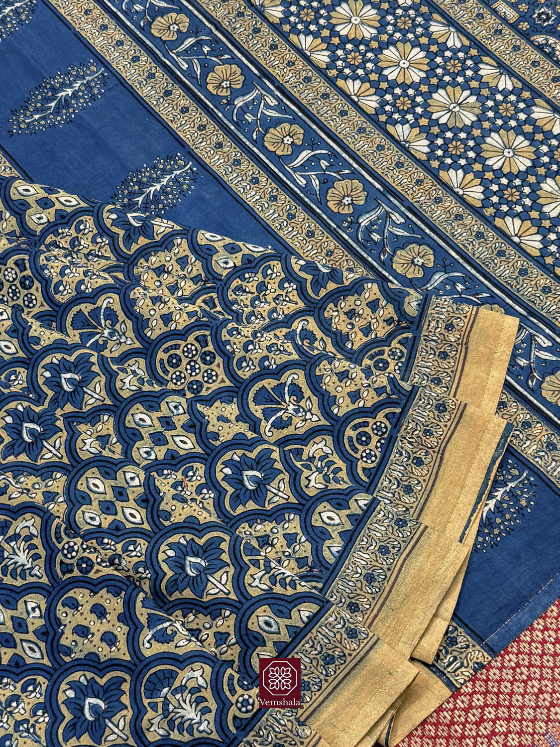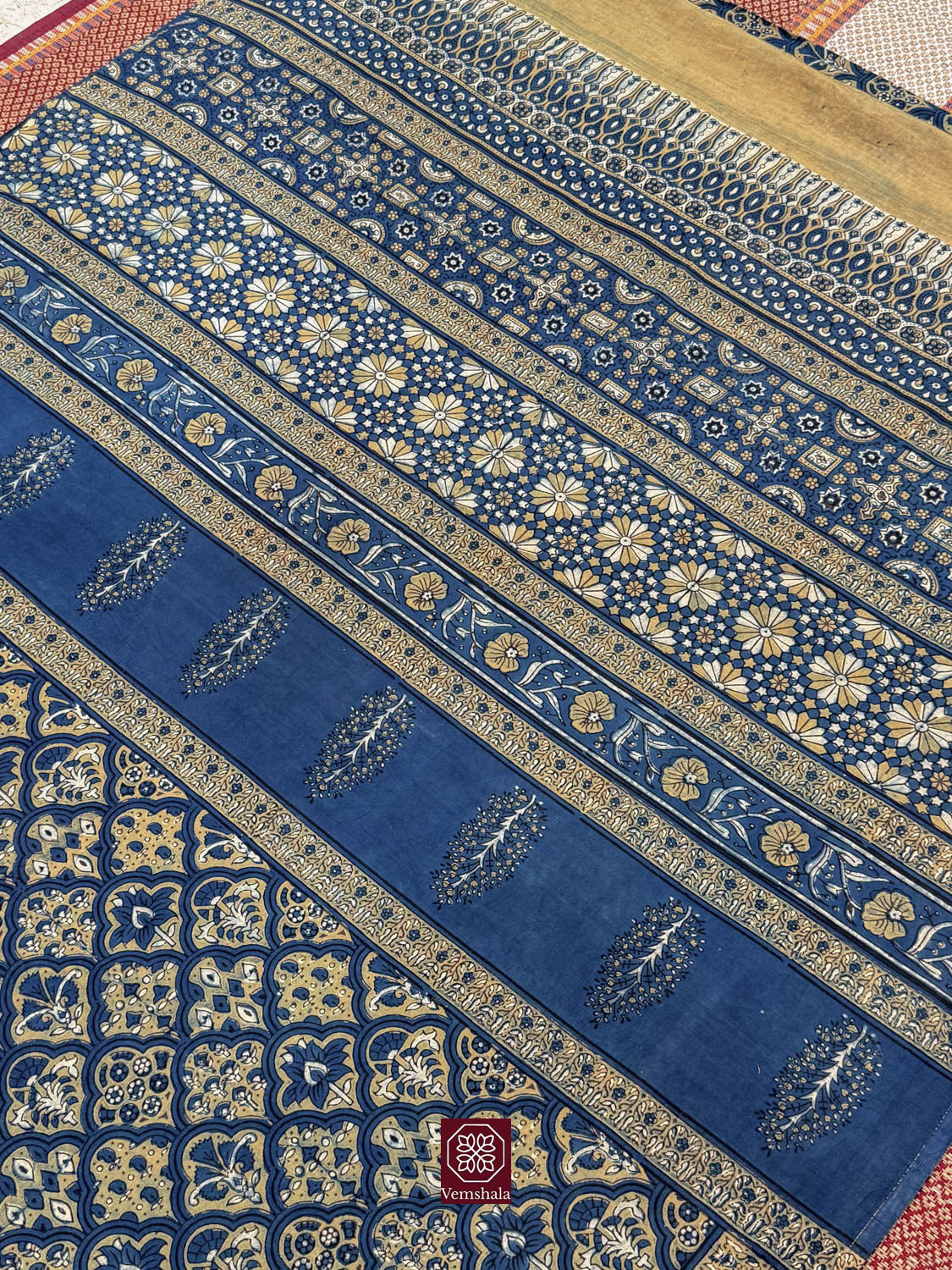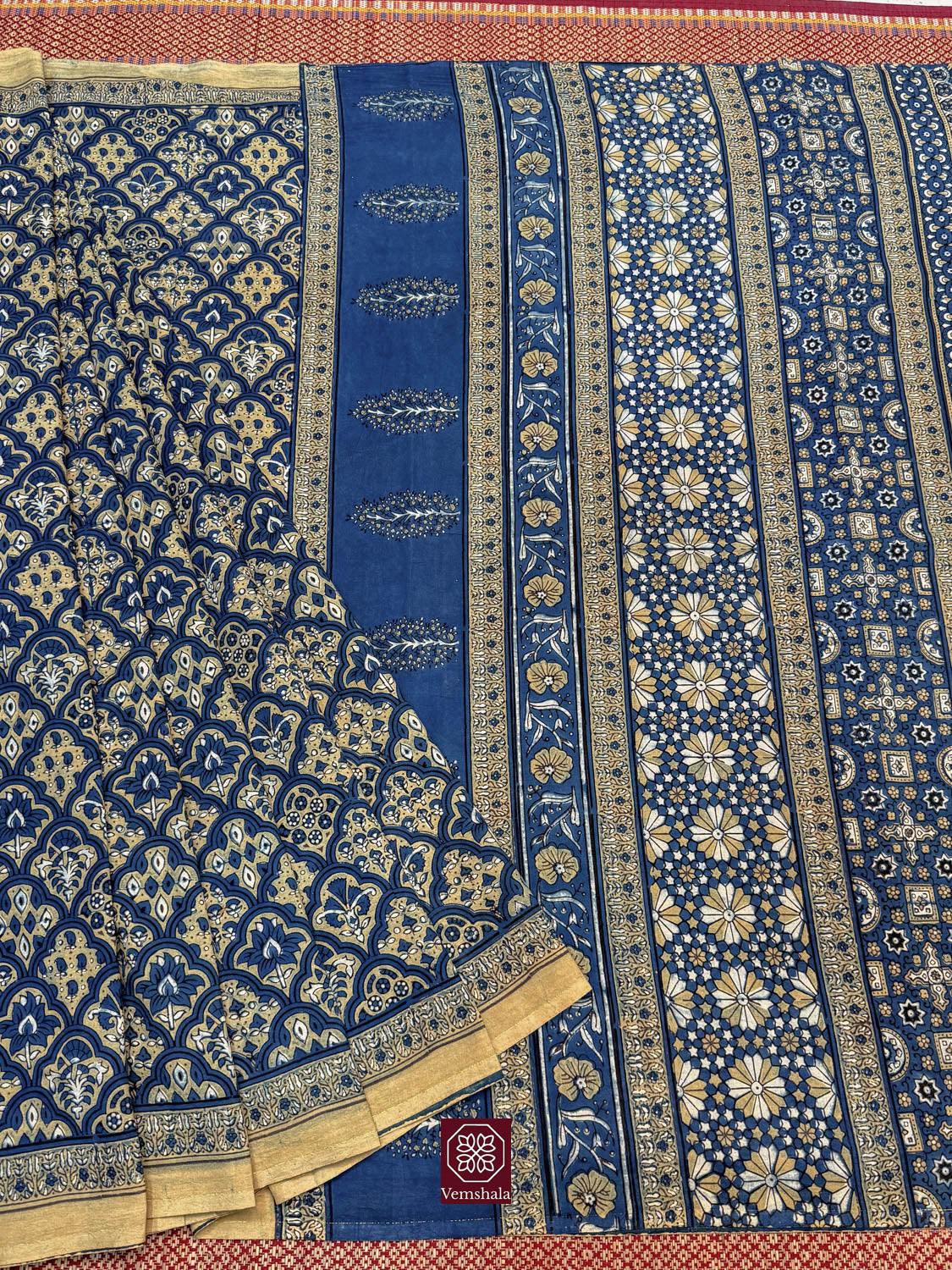 This authentic Ajrakh Cotton Silk  Saree is handcrafted by family of International acclaimed Artists for Ajrakh Art, from Kutch, Gujarat.