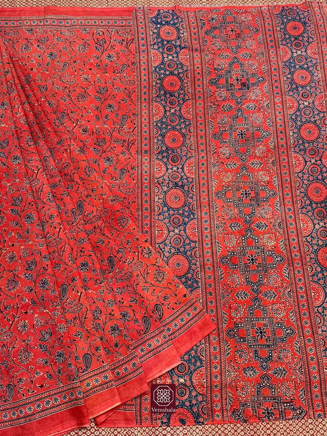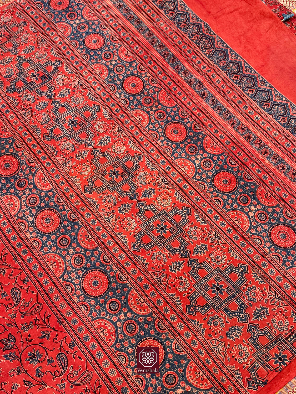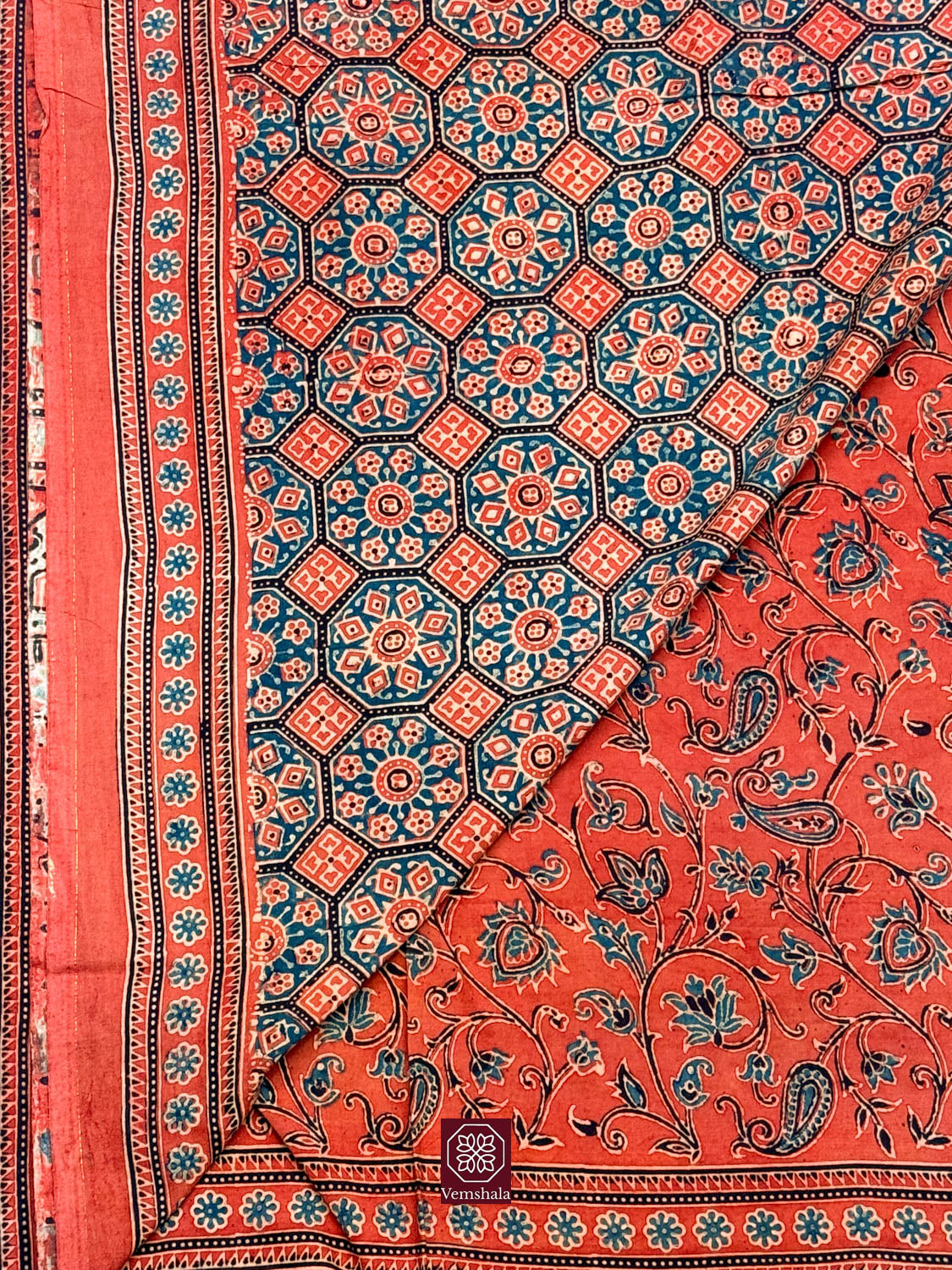 This authentic Ajrakh Cotton Silk  Saree is handcrafted by family of International acclaimed Artists for Ajrakh Art, from Kutch, Gujarat.