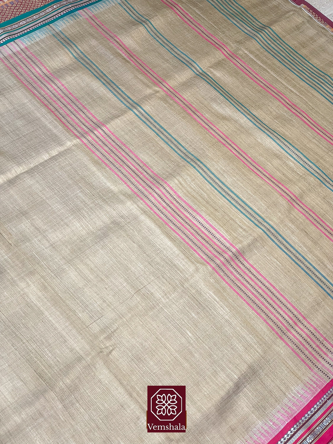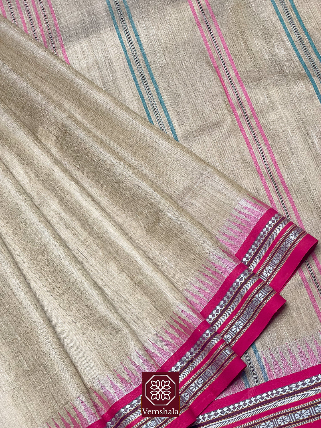 This handwoven saree from Vidarbha, a north-eastern region of Maharastra, India, is all about the beautiful, intricate borders which are designed combining different coloured threads in various patterns. “Karvat” in Marathi is the saw and since the designs look like saw tooth, the saree is known as Karvati Kinar or Karvat Kati. District Bhandara is a Tussar cocoon producing area and thus having plenty of raw material, raw or natural Tussar was introduced in weaving of Karvati Kinar Sarees.