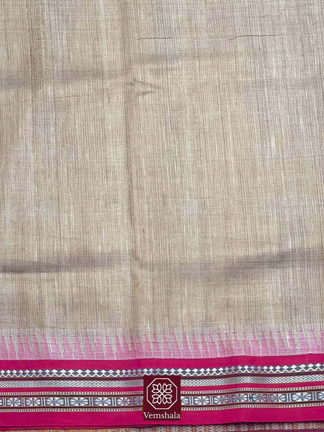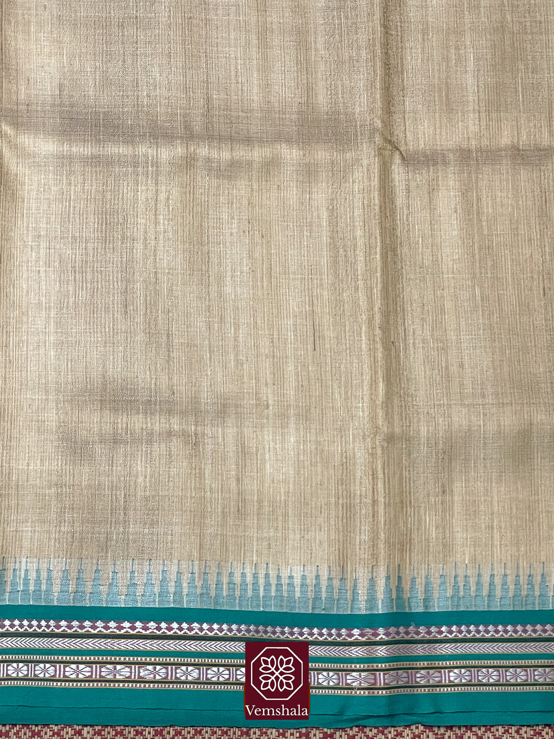 The uniqueness of the Tussar Karvati Kinar Saree is its border wherein traditional motifs are woven with extra warp threads controlled by lattice dobby and the saw tooth like temple motifs that are woven in varied sizes.