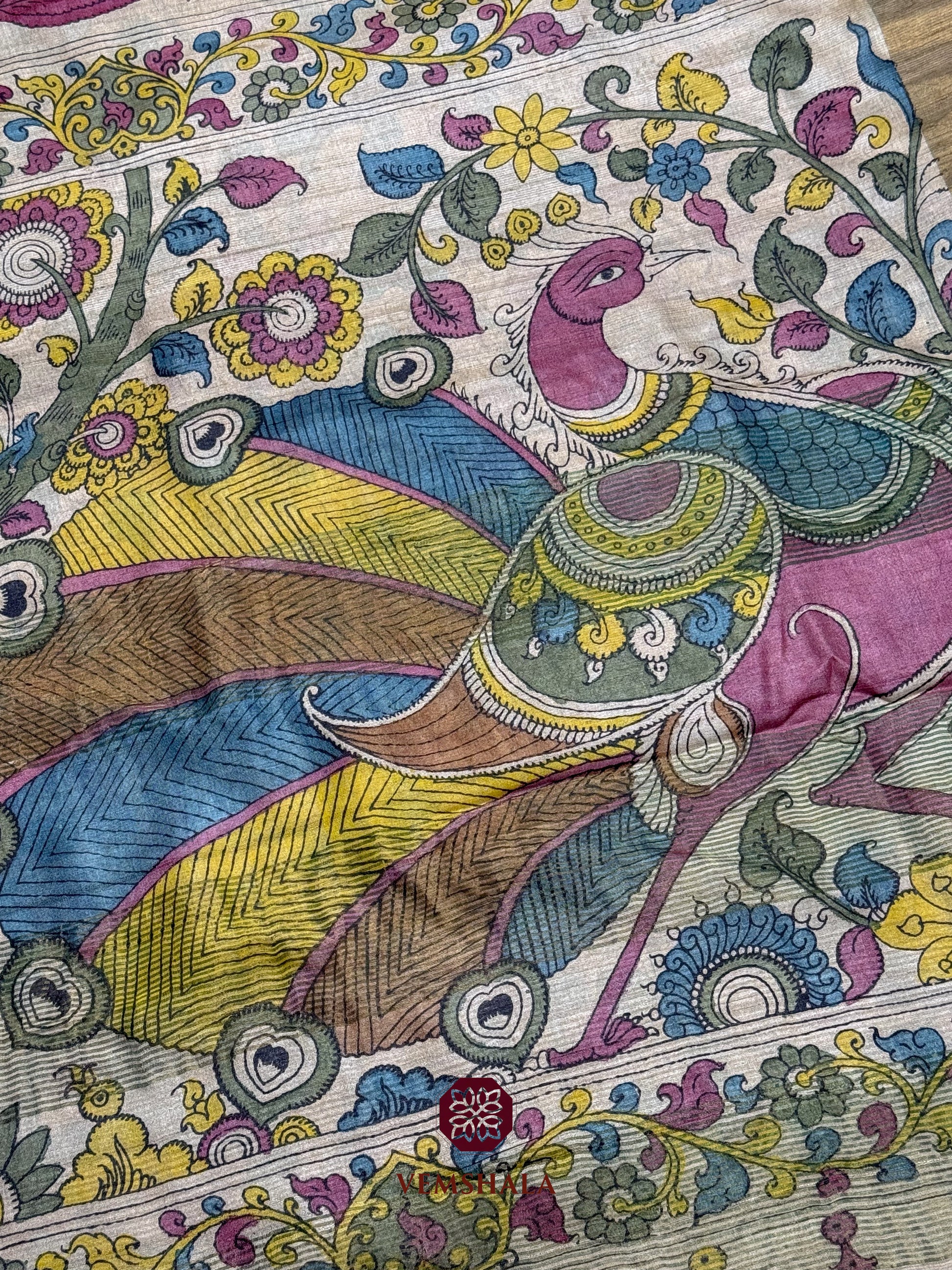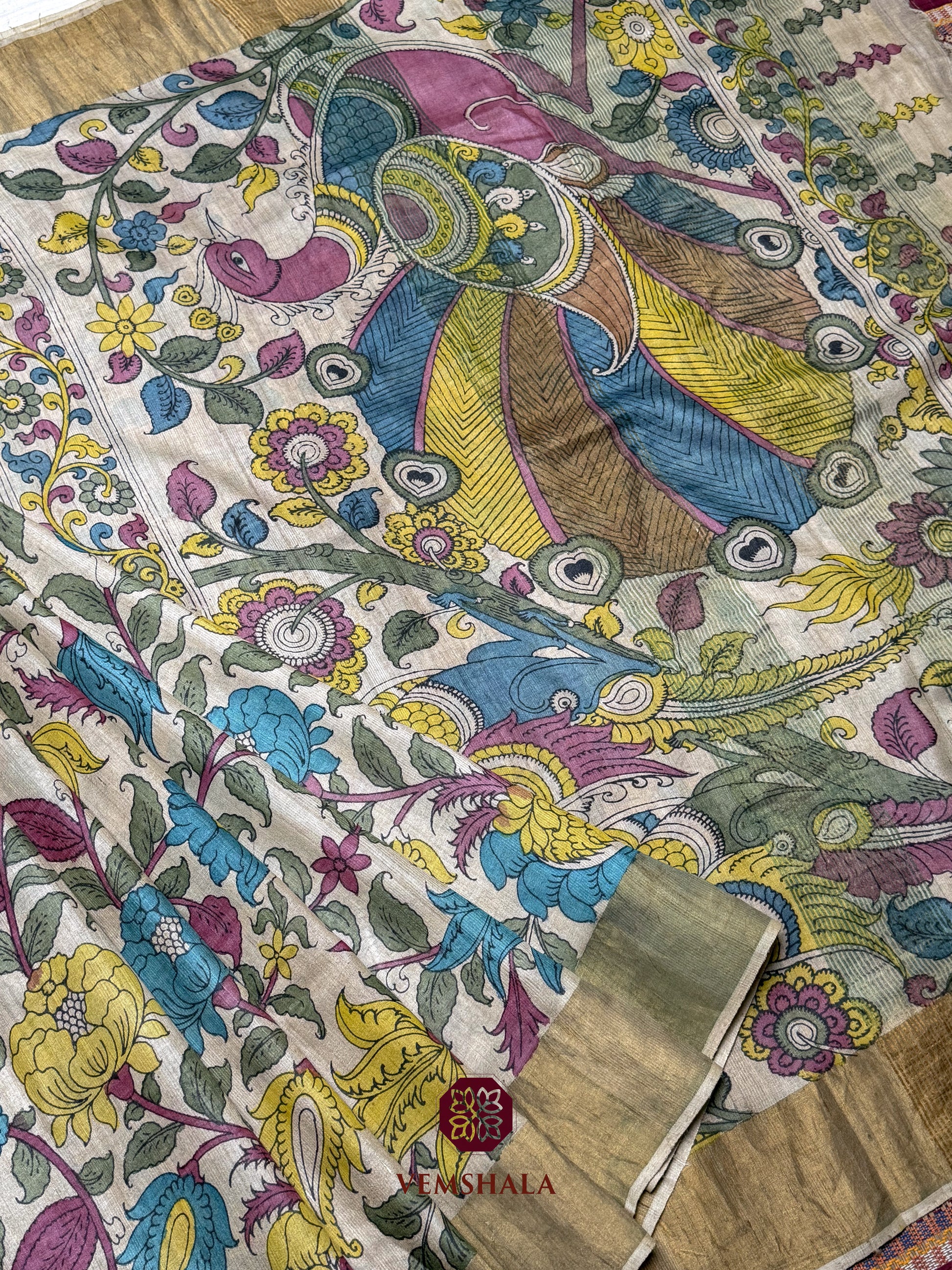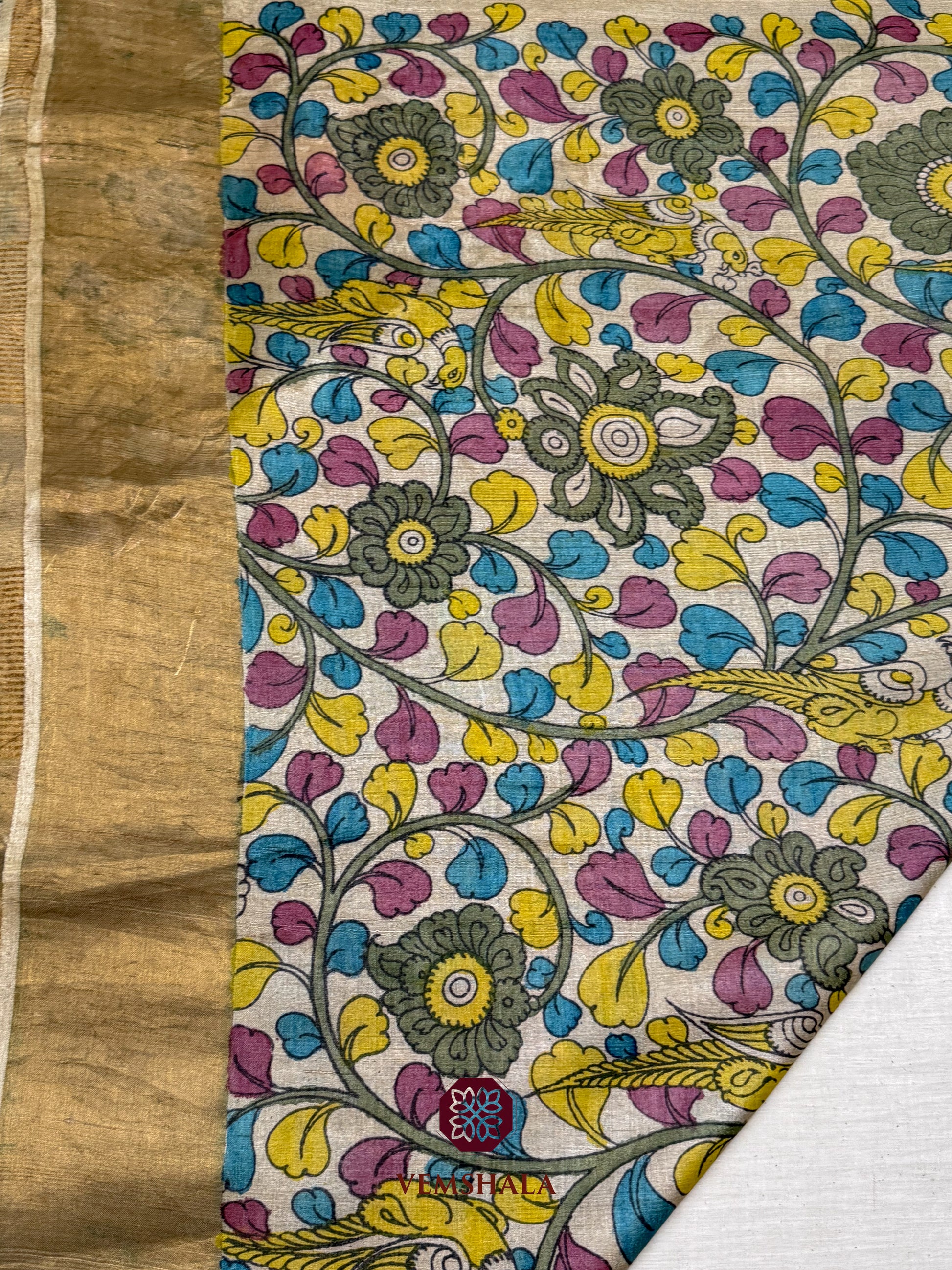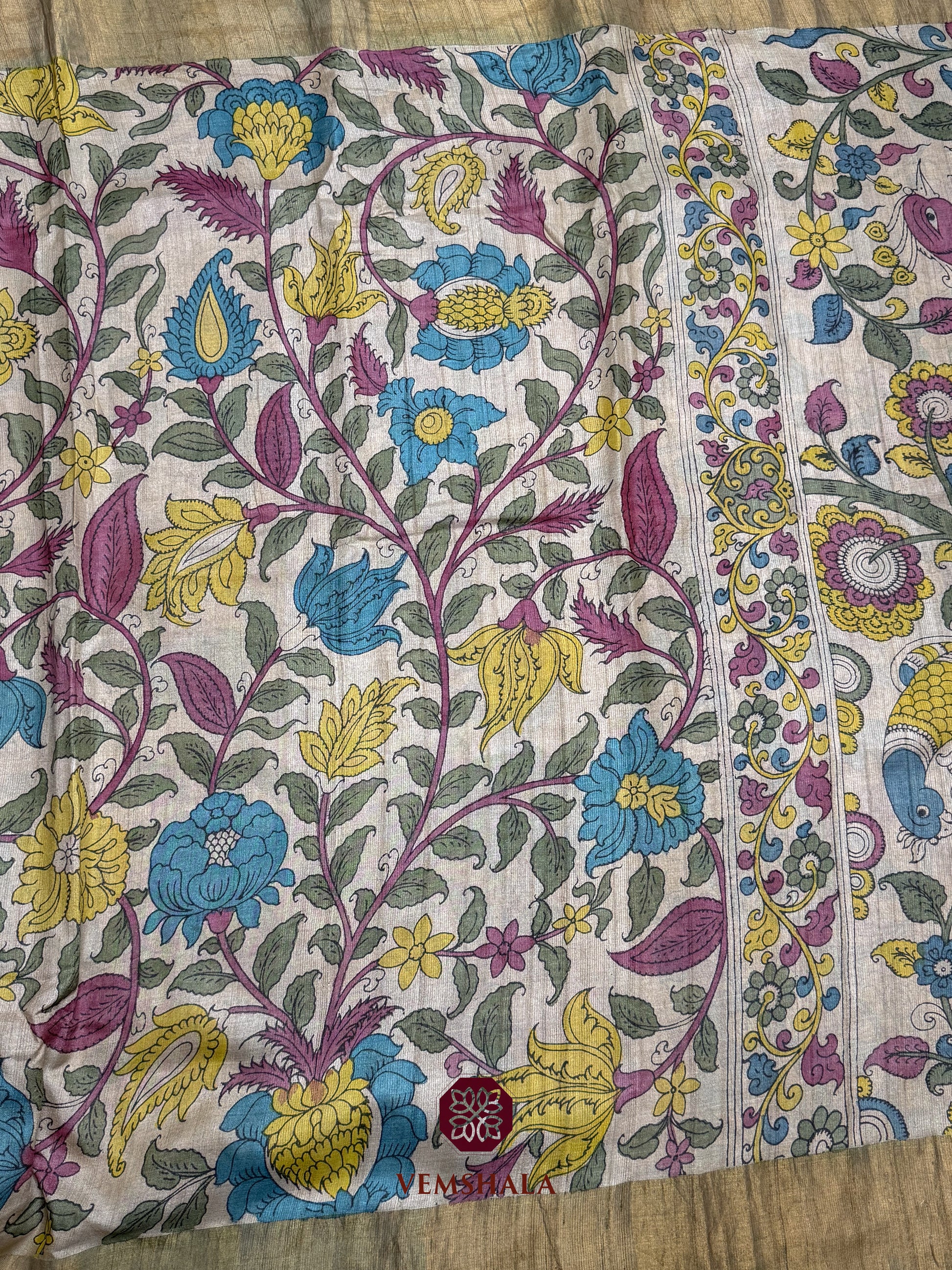 Natural / Multi / Floral Pen Kalamkari Tussar Silk Saree : Monica